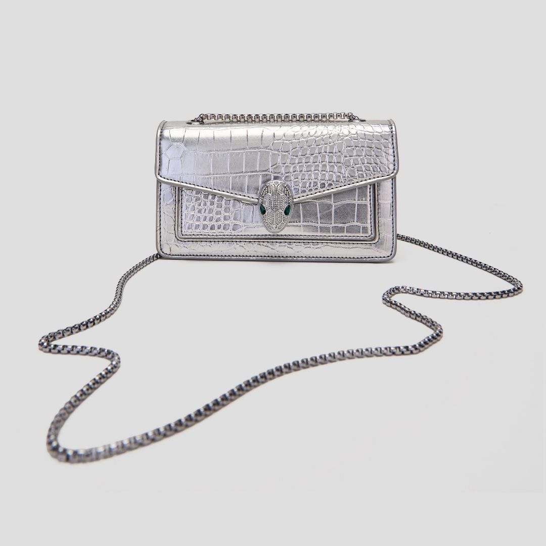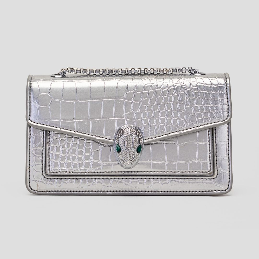 The Serpent Luxe Clutch is pure opulence in the palm of your hand. Its bold croc-embossed texture in a molten silver tone is paired with a jewel-encrusted serpent head clasp, exuding a powerful, luxurious vibe. Available in both gold and silver, this clutch is a show-stopper for galas, receptions, and evenings where you want every detail to speak of power and elegance. Compact yet impactful, itβs designed for the modern woman who commands attention without saying a word.